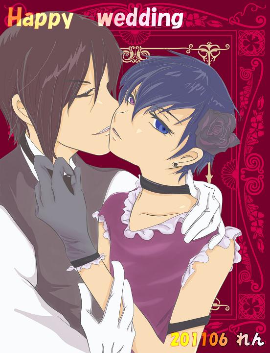 ○月×日 結婚式翌日 朝、目が覚めると、シエルが一糸纏わぬ姿で私の腕の中で眠っていた。 長くやわらかなブルネットの髪が少し乱れ、広がっている。 白く磁器のような肌には不釣り合いなほど、その華奢な身体のいたるところにいくつも の赤いバラが咲き、自分のものだと主張しているようで少し恥ずかしくなる。 昨夜は、夢中でお互いがお互いが求めあい過ぎてしまった。 シエルの身体に負担をかけてしまったかもしれないと不安になってしまう。 それでも、夫婦になって初めて迎える朝。 いつもより新鮮に感じるのは、気のせいでしょうか? シエルの穏やかな寝顔は、まだあどけなさが残っていて、昨夜の乱れた姿は誰も想像で きないでしょうね。 いいえ、誰にも想像させたりしませんが。 眠っているシエルのベリーのように色づいたやわらかい唇にキスをすると、シエルは、 目蓋をゆっくりとあけ、自分が何も纏っていないことに気付いたのか、白い頬をほんの りとバラ色に染めている。 何と初々しいんでしょう。 「おはようございます、シエル」 「おはよう、セバスチャン」 もう一度、軽くキスをすると、シエルを強く胸元に抱き寄せた。 「もう少し幸せな時間を過ごしてもいいですか?」 「・・・私もそうしたい」 私の問いかけに、小さな声で答えると、大きな青と紫のオッドアイの瞳を閉じる。 甘い香りのする髪に顔をうずめ、その匂いを堪能する。 あぁ、今日からシエルは私の妻なのですね。 公の場所でもやっとそう答えることができることが嬉しい。 今までは主人と使用人という立場でしたから、シエルとの関係はずっと秘密にしていま したし、そのことでシエルには、寂しい想いや辛い想いをさせてしまったこともたくさ んあるでしょう。 これからは、そんな想いをさせなくて済むことがとても嬉しい。 シエルはどう思ってくれているのでしょう? 「シエルは、私を夫として、みんなに紹介できることは嬉しいですか?」 「あ、当たり前でしょう。ずっとそうなれば良いと思っていたんだから・・・」 シエルはそっけない口調で言ってますが、こういう言い方をするときは、照れている時 なんですよね。 10歳の時からそばにいて、大事に愛しみながら、育ててきたのですから、シエルの言 動の裏にある本心なんてお見通しです。 本当は一日中、シエルとベットの上で抱き合っていたいところですが、執事としての仕 事も私の大事な役目。 「そろそろ朝食の用意を致しましょうか、シエル」 額に軽くキスをする。 シエルは大きな青と紫のオッドアイの瞳で見上げると、美しい眉根をよせ、不満そうな 顔をする。 「セバスチャン。朝食はもう少し遅くても良いわ。もっとこうしていたい」 シエルは細い腕を背中にまわし、自分の身体をすりよせてくる。 やわらかな胸が胸元に押しつけられ、軽く眩暈がする。 「私もシエルと同じようにこうしていたいですよ。でも、今日は会社の仕事もあります し・・・」 「全部、キャンセルするわ」 シエルはきっぱりと言い切る。 「そういうわけにはいきません。お互いがお互いの仕事をきちんとする。それは、約束 しましたよね?」 「そうだけど、一日ぐらいいいでしょ?今までだって、そういうことはあったんだし」 確かにそういうことはありましたよ、私のせいで・・・。 困ったように考えこんでいる私をシエルは、くすくす笑いながら見上げる。 「冗談よ。セバスチャン、本気で考え込まないでよ」 真剣に悩んでいたんですけど、私は。 「・・・困った奥様ですね、シエルは・・・」 華奢なシエルの身体の上に覆いかぶさると、やわらかなブルネットの髪をなでる。 「セバスチャンを一生困らせるかもよ、私、我儘だから」 私の頬にかかった髪を耳にかけ、そのまま整えられていない髪に指を絡める。 まっすぐに私を見つめる瞳は、迷いがなく、いまだ穢れを知らない少女のように美しい。 シエルが「女王の番犬」だと言っても、誰も信じないだろう。 今までどれだけの血を流し、女王の憂いを晴らしてきたことか。 そばでみてきた私しか知らない、シエルの本当の顔。 「知っていますよ、貴女がどれだけ我儘か」 シエルの額に、頬に、鼻に、瞳にキスをおくる。 くすぐったそうに、瞳を細めるシエル。 「私も知っているわ、セバスチャンがどれだけ我儘か」 「私がいつ我儘をいいましたか?」 「我儘とは言わないのかしら?私をどんな時でも、独占したいと思っていることを」 確かに、私の我儘かもしれないですね。 シエルに近づく者は、誰であっても嫌だと思ってしまうのは・・・。 「・・・気づいてましたか?」 「私もきっと同じ気持ちだから。・・・いつでも私だけを見ていて欲しい。私の事だけ 考えていてほしい。他の女性と話さないでほしい・・・。私だけのセバスチャンでいて」 少し照れたように、はにかんだ笑みを浮かべる。 「私も、同じことをいつも考えていますよ。私だけのシエルでいてほしいと・・・」 シエルの耳
